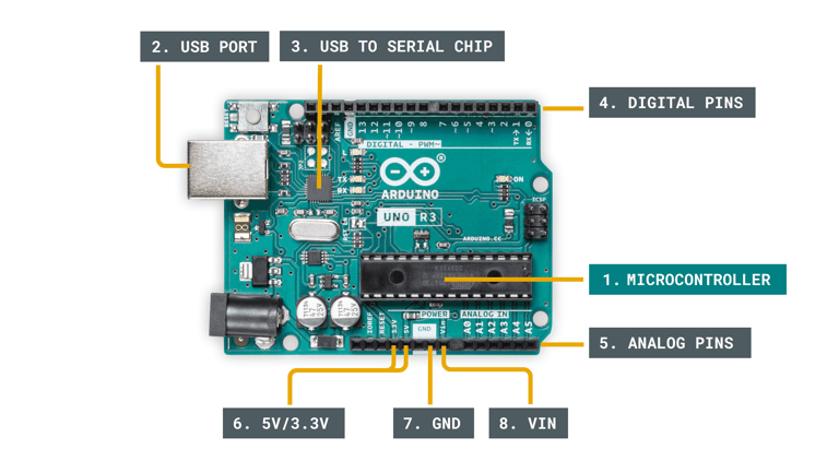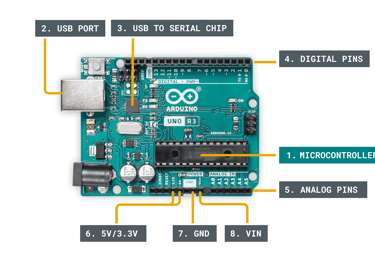 Key components of an Arduino board.