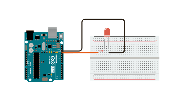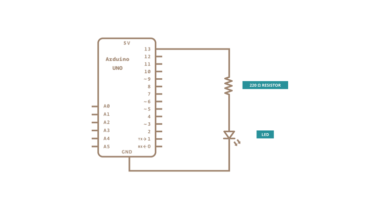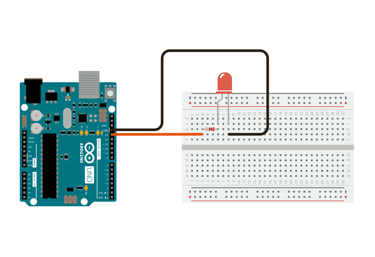 A simple example of a circuit, is an LED circuit. A wire is connected from a pin on the Arduino, to an LED via a resistor (to protect the LED from high current), and finally to the ground pin (GND). When the pin is set to a HIGH state, the microcontroller on the Arduino board will allow an electric current to flow through the circuit, which turns on the LED. When the pin is set to a LOW state, the LED will turn off, as an electric current is not flowing through the circuit.