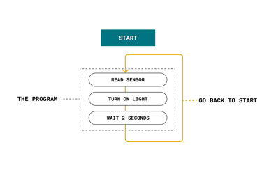 The program that is loaded to the microcontroller will start execution as soon as it is powered. Every program has a function called "loop". Inside the loop function, you can for example:
