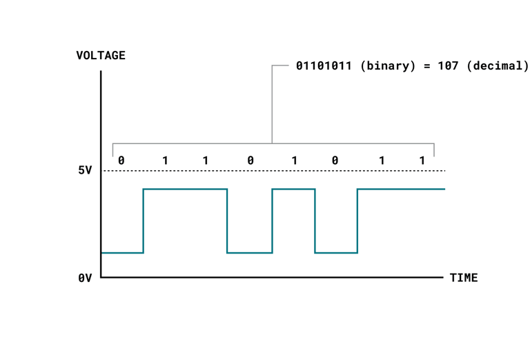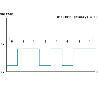 Digital signals might seem very basic (just 0 or 1), but are actually way more advanced. For example, we can create a sequence by sending a high or low state rapidly a number of times. This is known as a binary sequence or a bitstream.